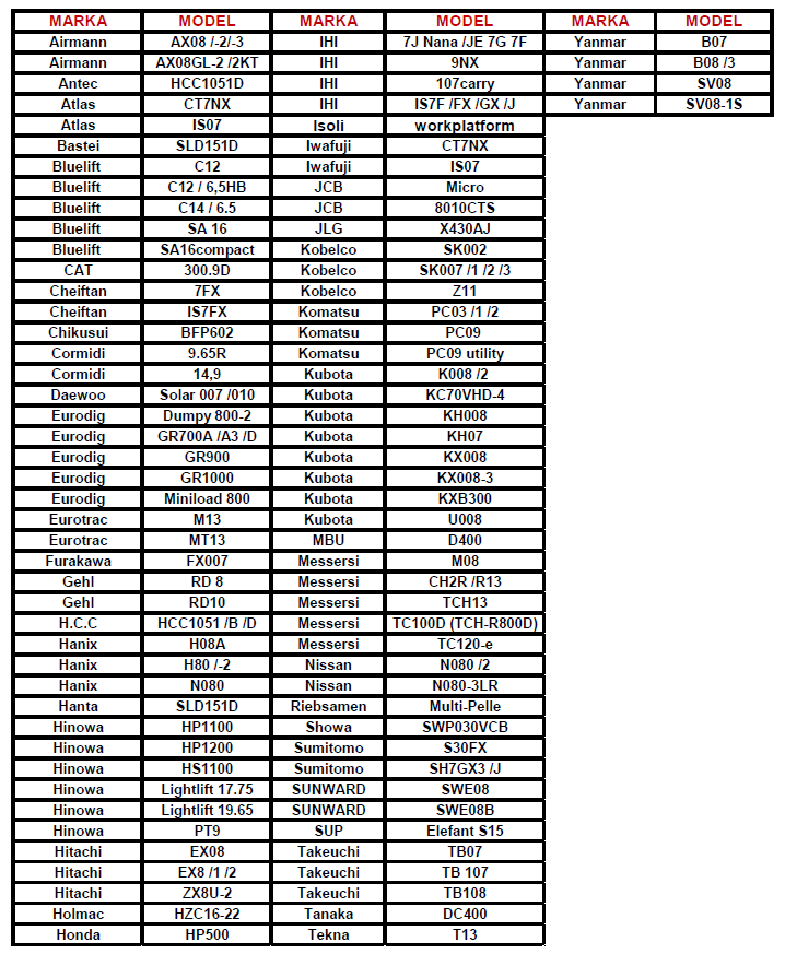 Tabela poniżej przedstawia zastosowanie gąsienic gumowych o wymiarach 180/72/37 w różnych modelach koparek.