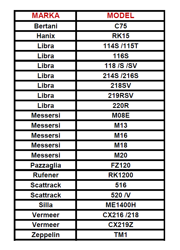 Tabela poniżej przedstawia zastosowanie gąsienic gumowych o wymiarach 230/72/45 w różnych modelach koparek.