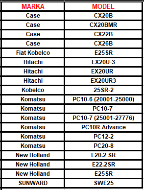 Tabela poniżej przedstawia zastosowanie gąsienic gumowych o wymiarach 250/52,5/76 w różnych modelach koparek.