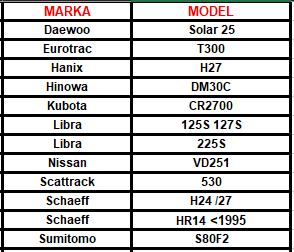 Tabela poniżej przedstawia zastosowanie gąsienic gumowych o wymiarach 300/109N/36 w różnych modelach koparek.