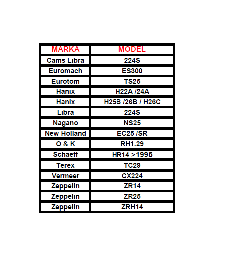 Tabela poniżej przedstawia zastosowanie gąsienic gumowych o wymiarach 300/55/72 w różnych modelach koparek.