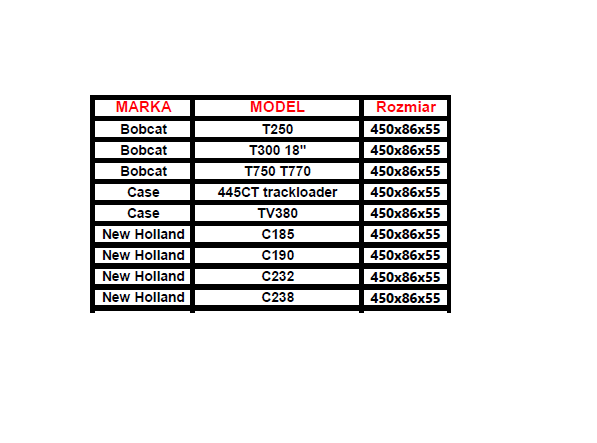 Tabela poniżej przedstawia zastosowanie gąsienic gumowych o wymiarach 450/86/55 w różnych modelach koparek.