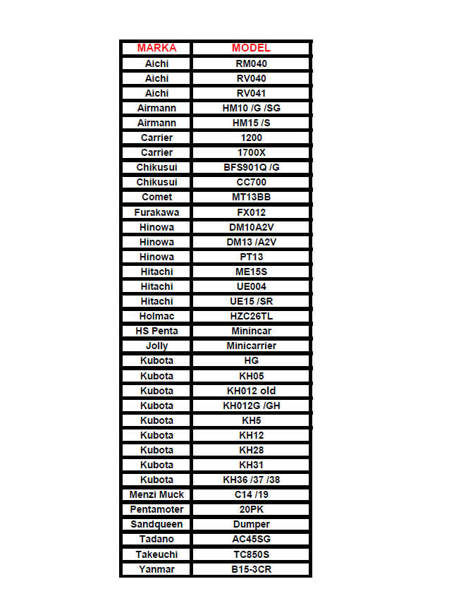 Tabela poniżej przedstawia zastosowanie gąsienic gumowych o wymiarach 200/72/42 w różnych modelach koparek.